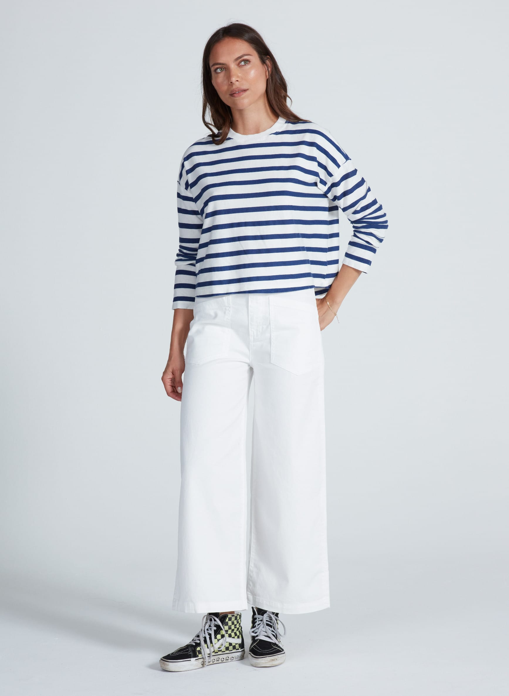 One of our best-selling fits. The Virginia is a cropped wide-leg pant with front patch pockets and a flattering high rise. Designed to be worn every day, whether you're dressing it up or down.