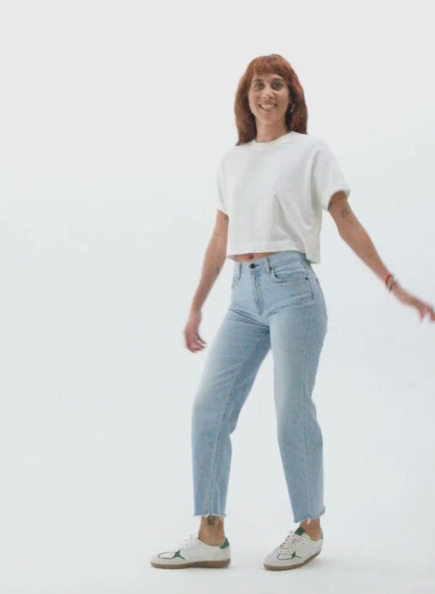 A high rise comfort stretch wide leg with cropped inseam and a fray hem, featured in our light blue Zuma wash.