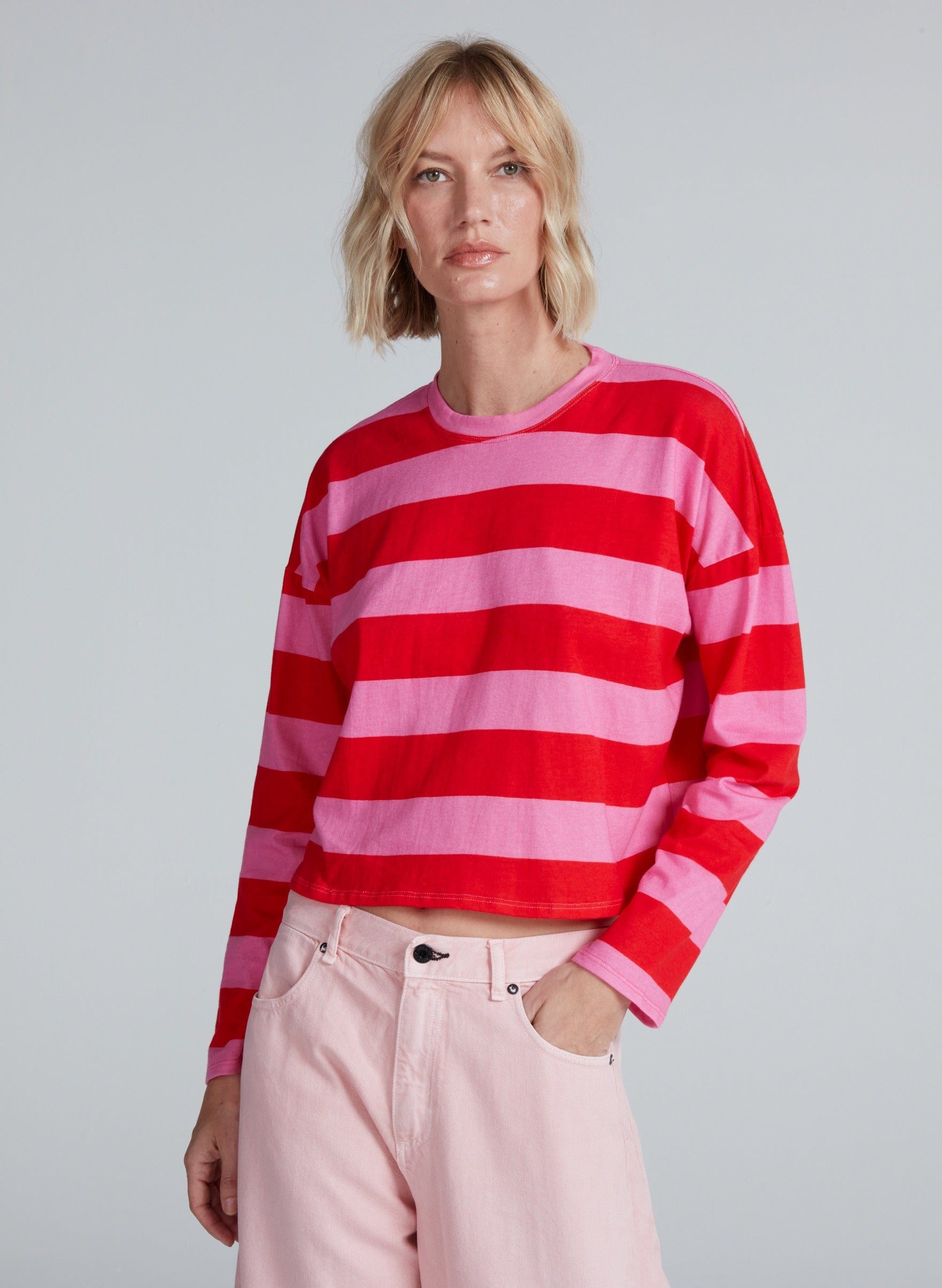 A classic striped essential with a modern cropped silhouette. Designed with a relaxed fit and soft hand feel, this long sleeve tee is crafted from 100% American knit cotton for everyday comfort and breathability. An easy layering piece that pairs effortlessly with denim.