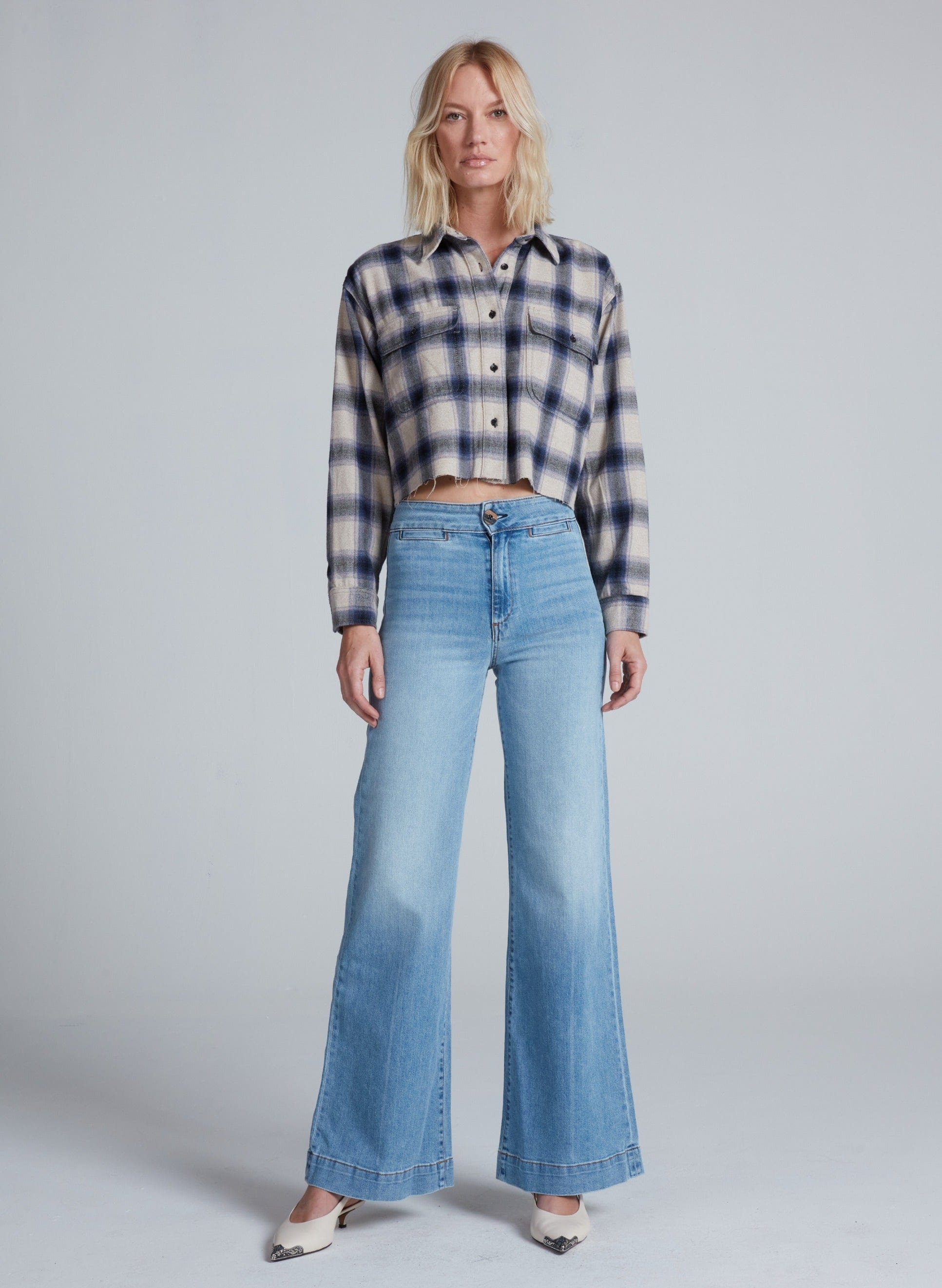 A soft, cropped flannel shirt designed with an easy, relaxed fit and classic utility details. The Crosby Flannel features a button-front closure, chest flap pockets, and a slightly boxy cut that hits at the waist for effortless layering or standalone wear. Crafted from Japanese cotton shirting, it blends comfort with everyday versatility.
