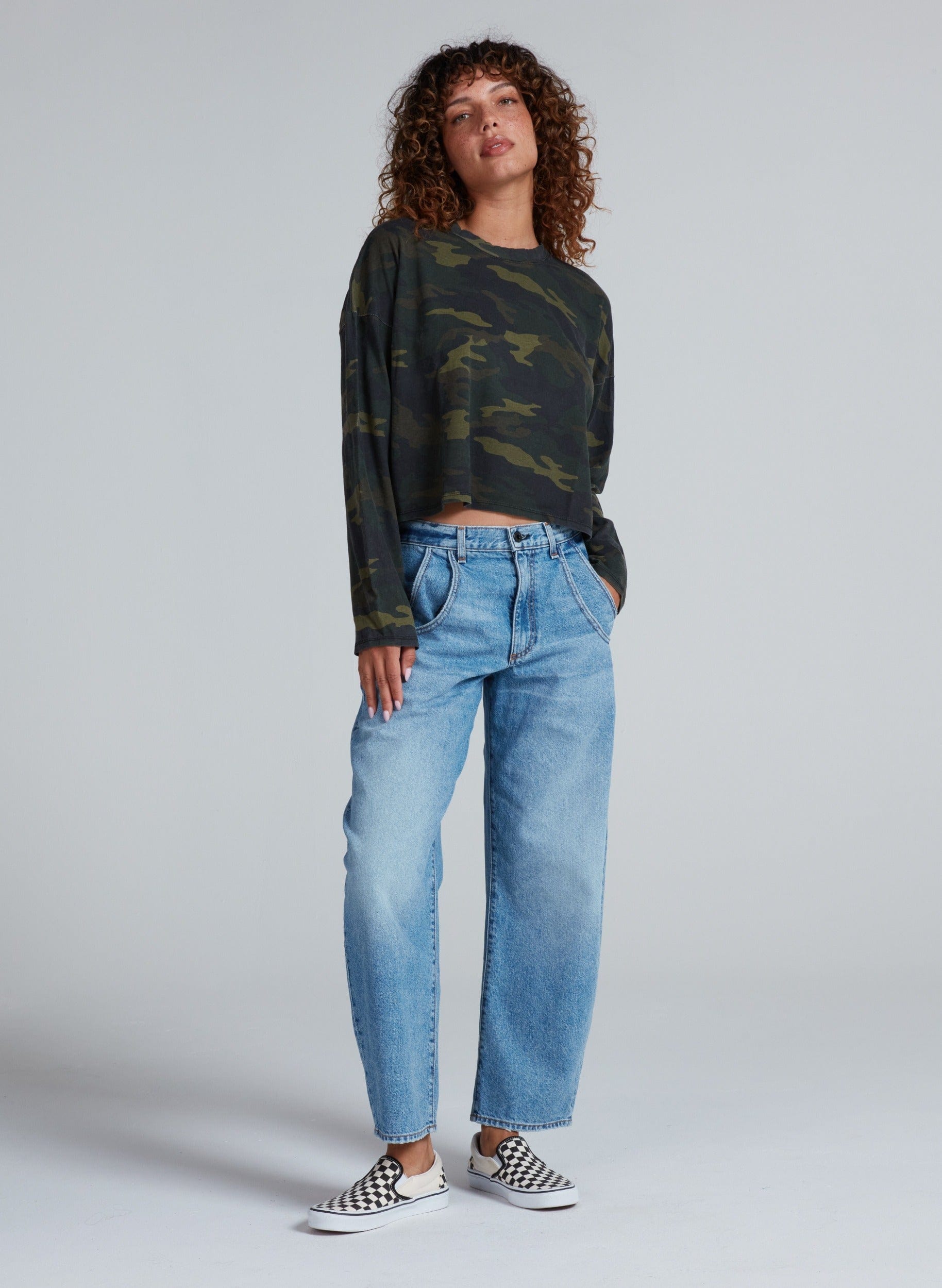 A classic striped essential with a modern cropped silhouette. Designed with a relaxed fit and soft hand feel, this long sleeve tee is crafted from 100% American knit cotton for everyday comfort and breathability. An easy layering piece that pairs effortlessly with denim.