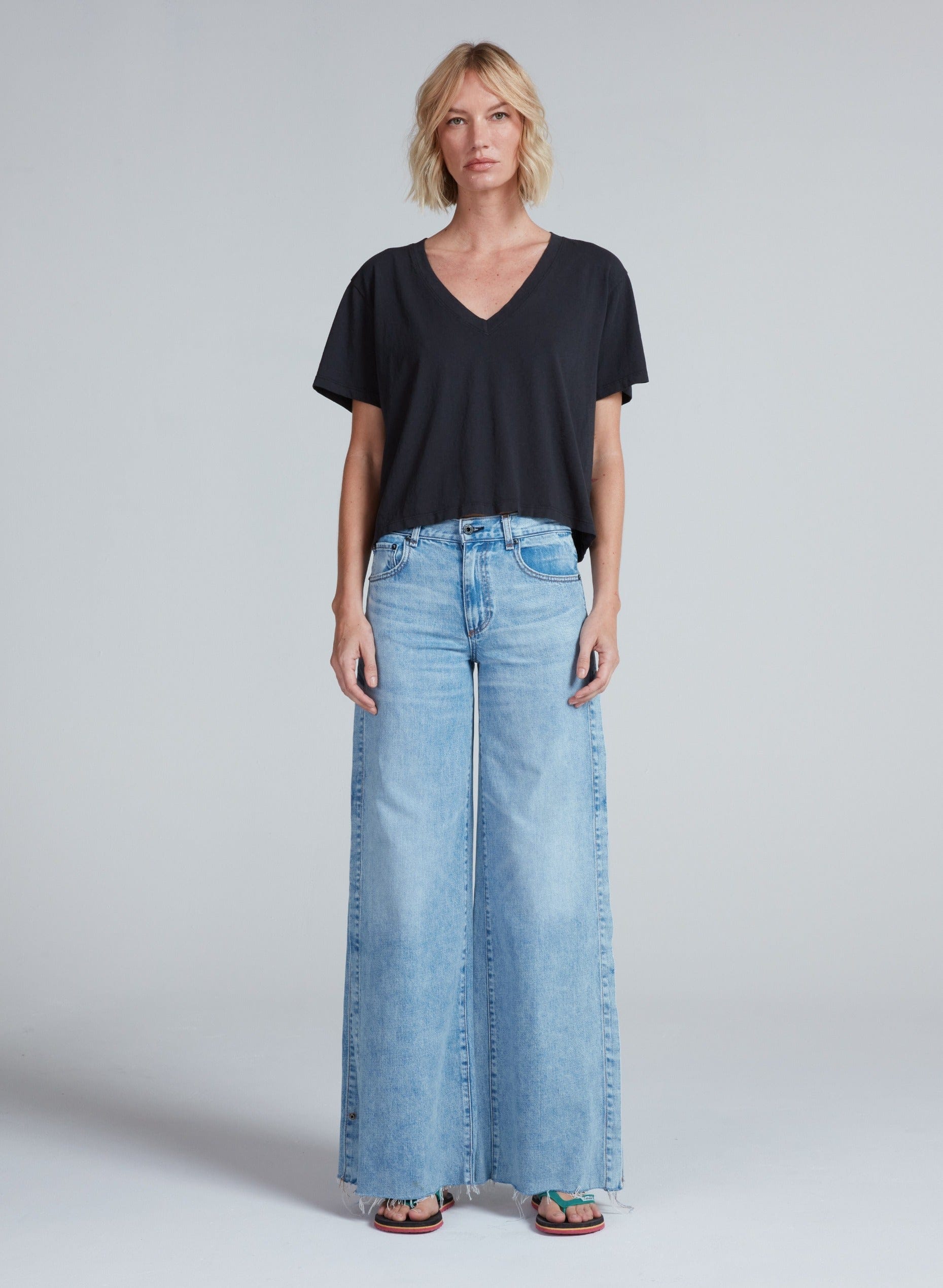 The Shrunken V is a relaxed, cropped tee with a soft v-neck and easy drape. Derived from the Shrunken Boy Tee, this style maintains the same broken-in feel and effortless silhouette while offering a more open neckline for a laid-back, refined look. Made from lightweight American knit cotton, it's an everyday tee that pairs seamlessly with denim, trousers, or layered looks.