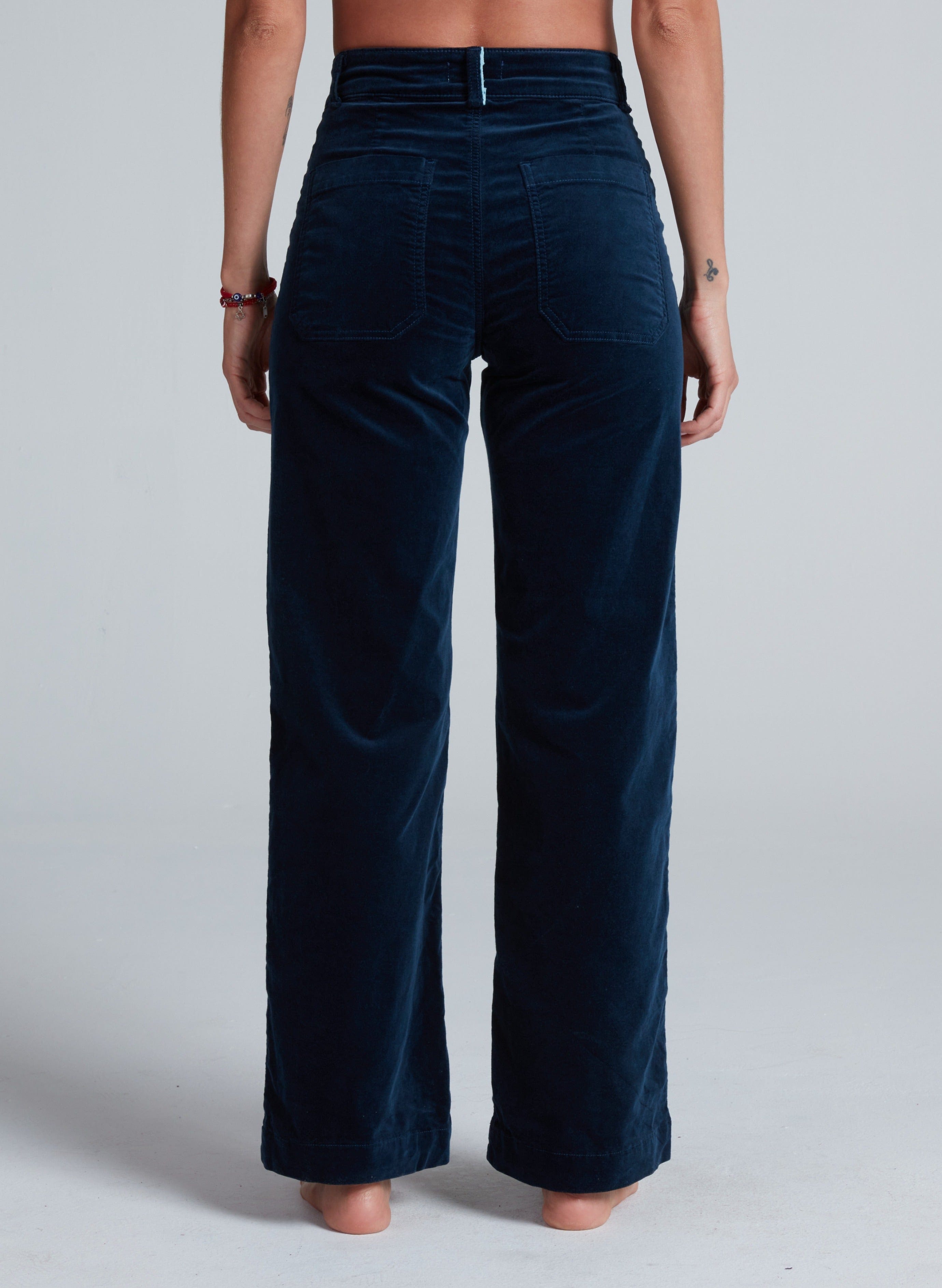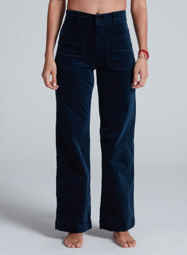 Our classic silhouette featuring a high rise, relaxed wide leg, and iconic sailor pocket details. The Sailor is reimagined in soft stretch velvet, offering a luxurious update to this timeless shape. Designed with clean patch pockets and a cropped inseam, it balances vintage inspiration with modern versatility—perfect for both day and evening wear.