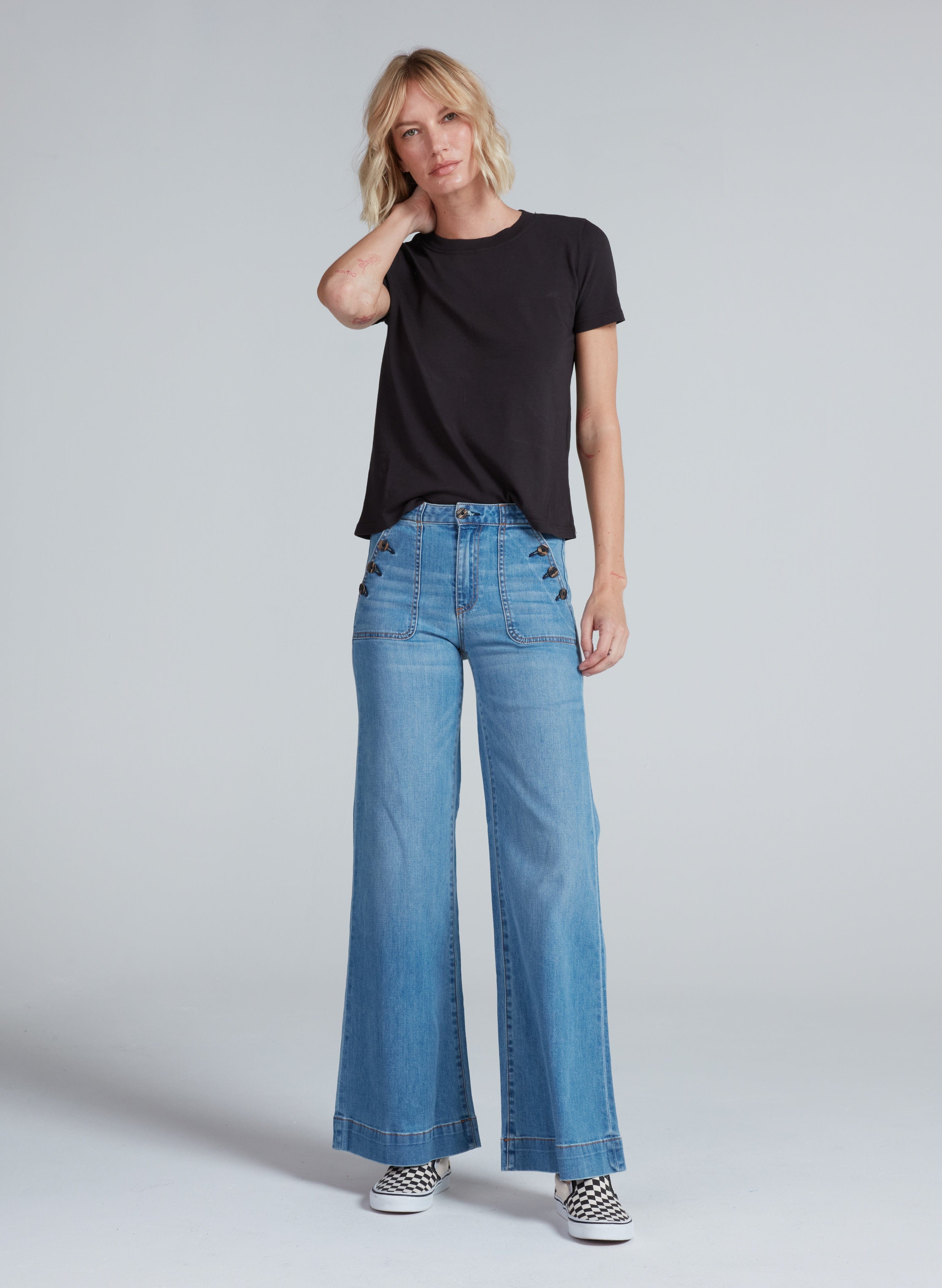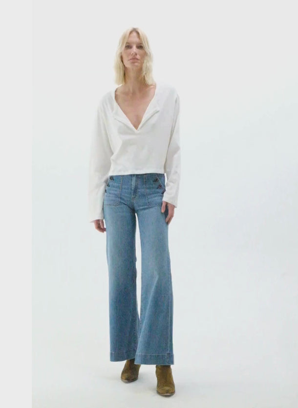 A true throwback silhouette with a modern edge. The Brick House Wide Leg sits high on the waist and falls into a dramatic wide leg with vintage-inspired panel seaming with horn buttons and hem detail. Made from soft Japanese indigo denim with a hint of stretch for comfort and structure in our Harbor wash.