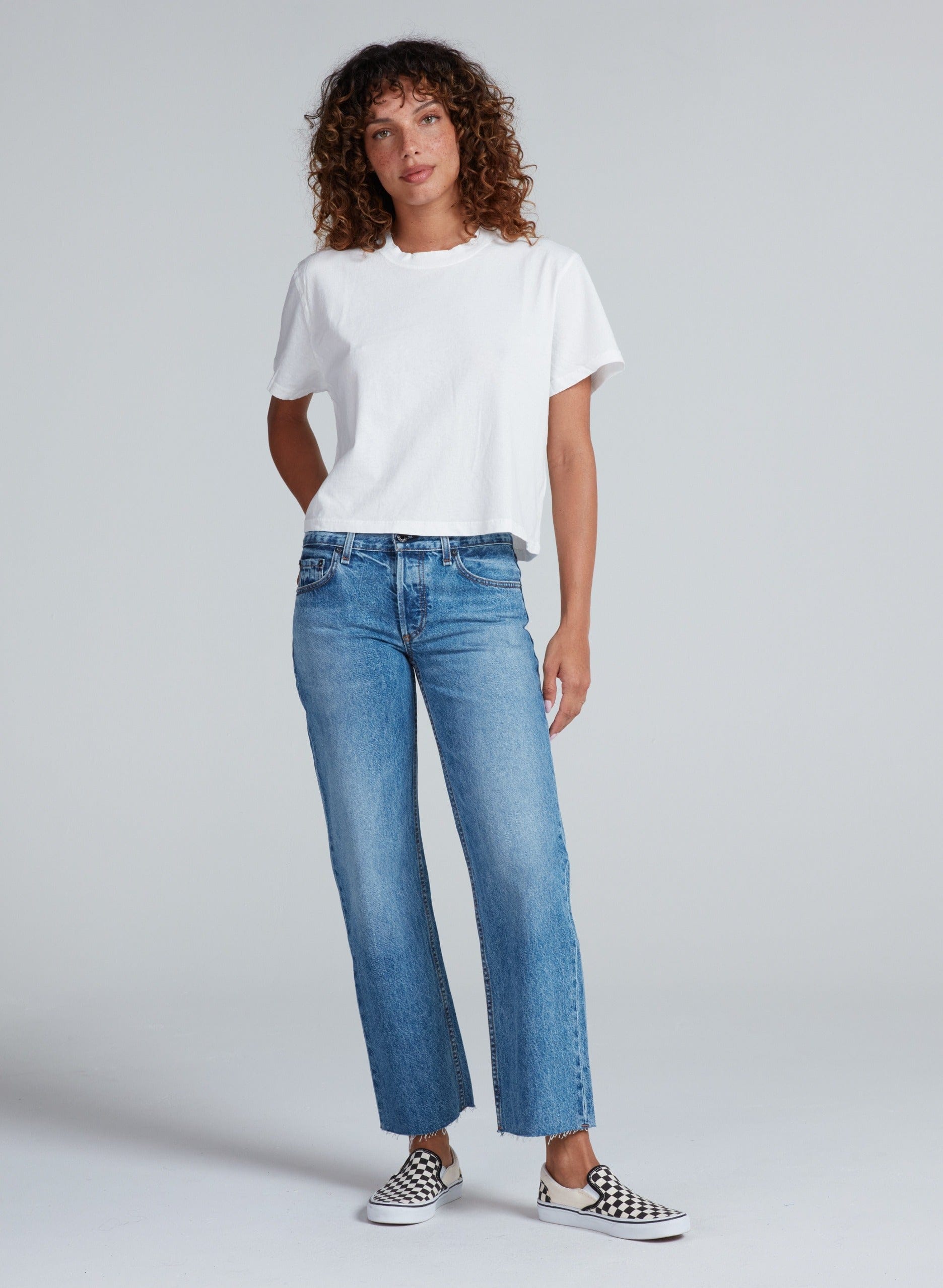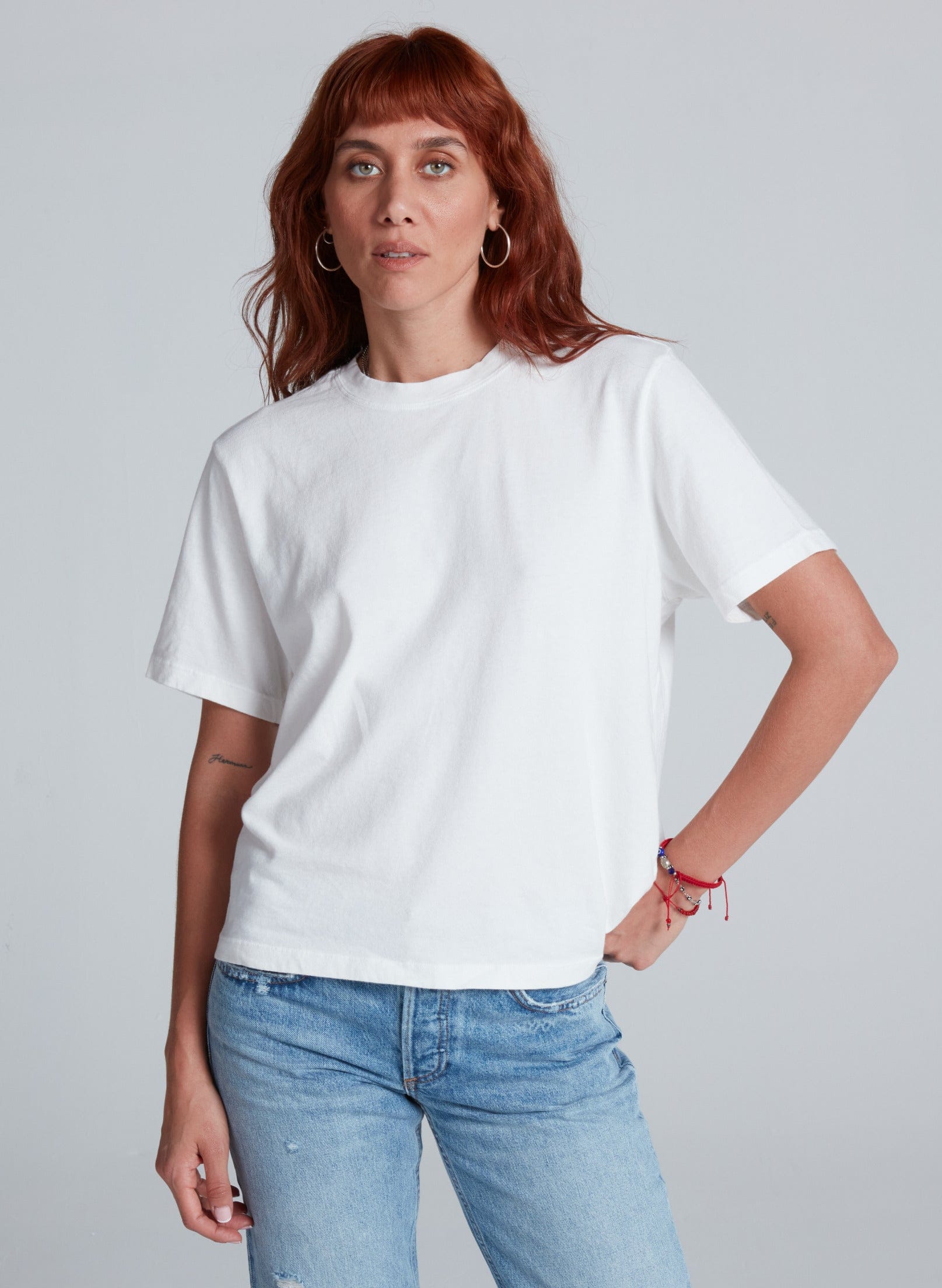 A shrunken crewneck tee with a slightly cropped, boxy fit. Designed to hit right at the waistband with a soft broken-in feel. Printed or solid, it's an easy everyday shape.