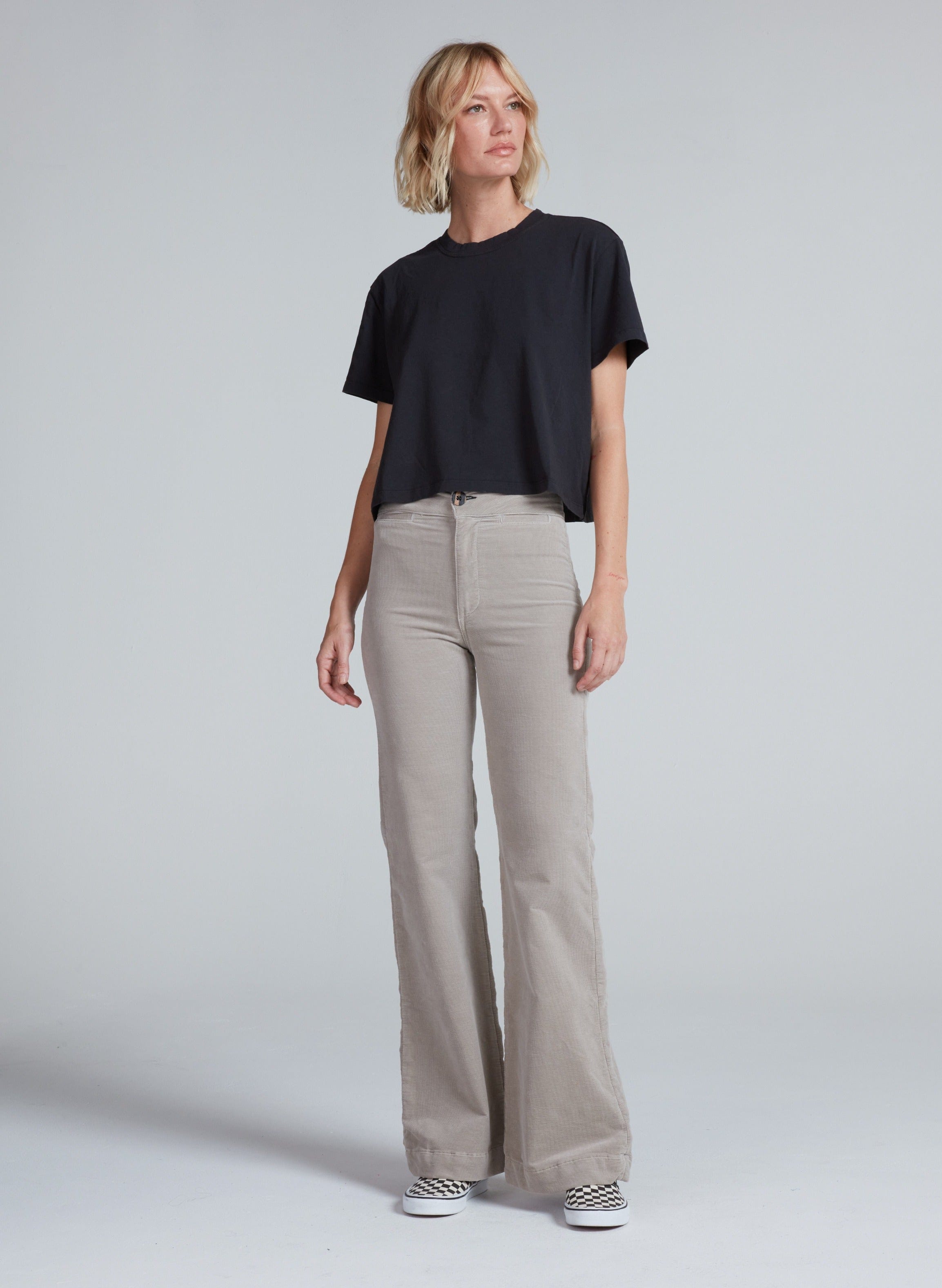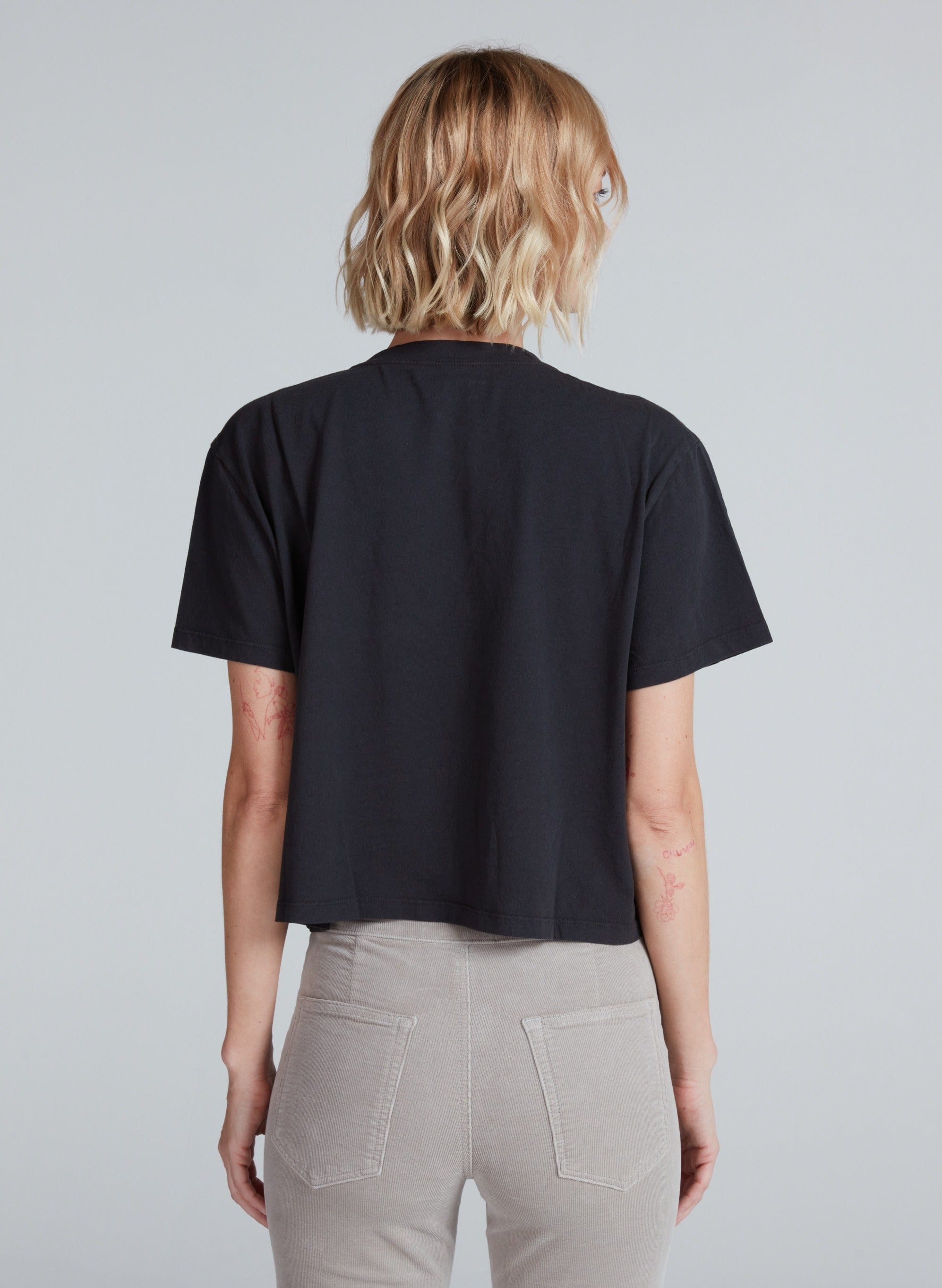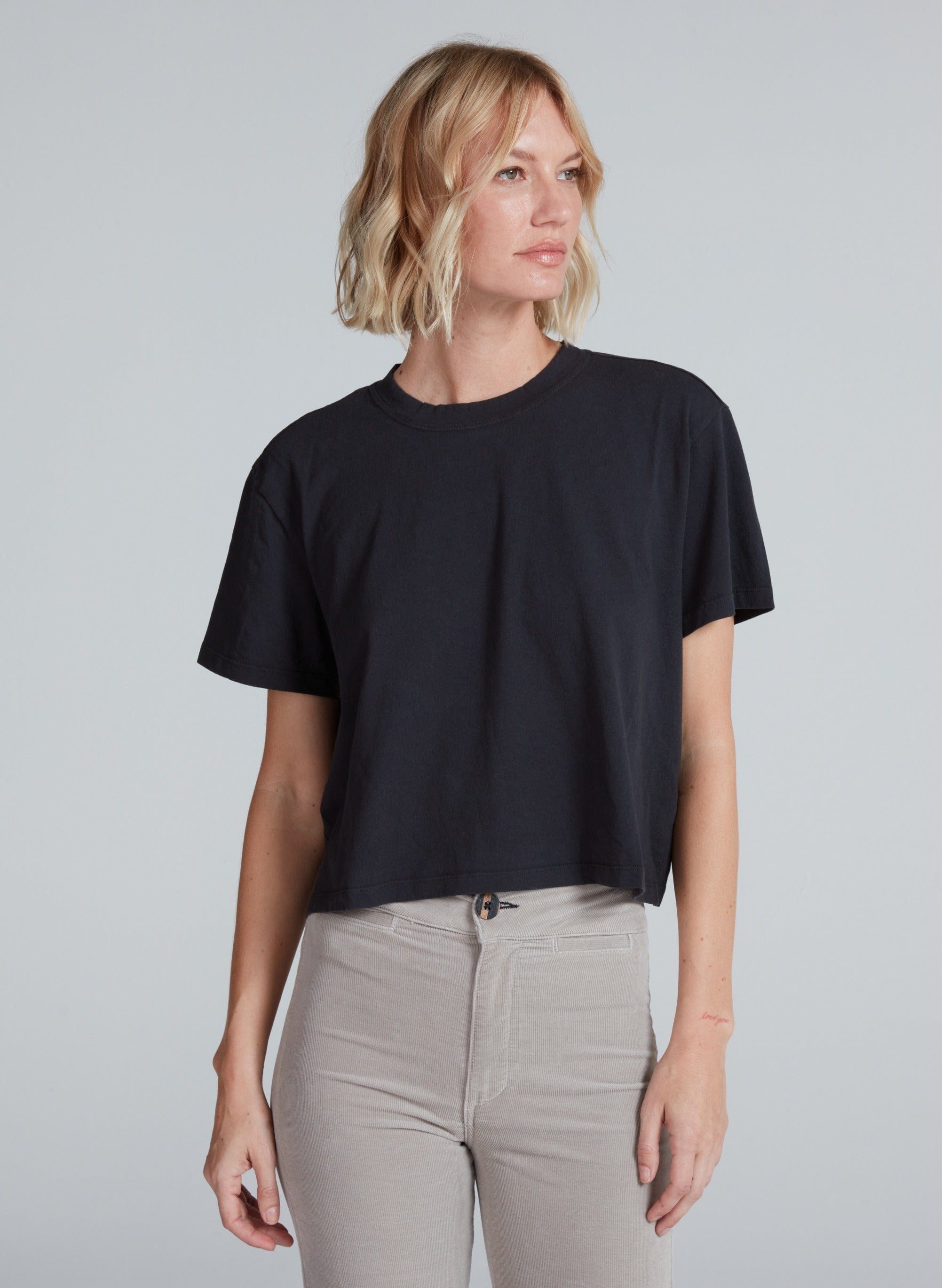 A shrunken crewneck tee with a slightly cropped, boxy fit. Designed to hit right at the waistband with a soft broken-in feel. Printed or solid, it's an easy everyday shape.