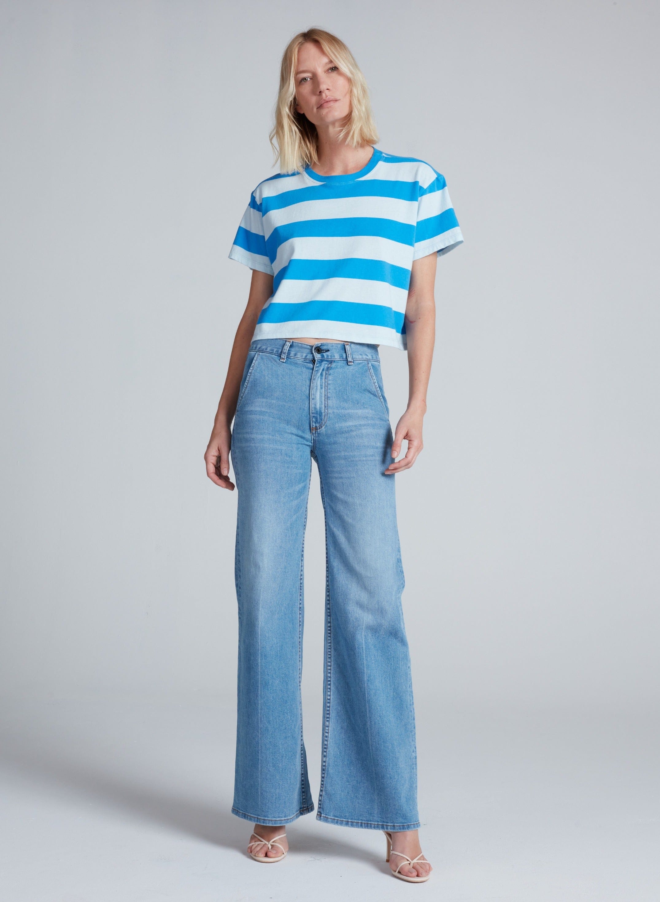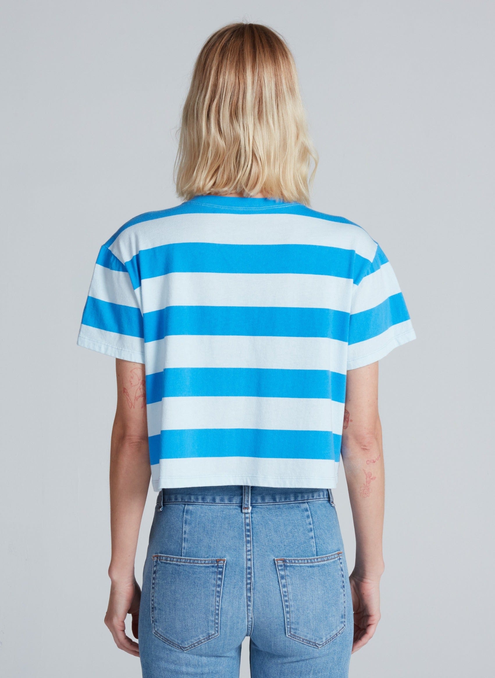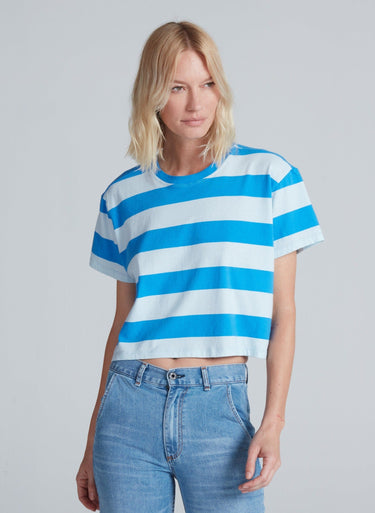 The Shrunken Boy Tee is a classic crewneck updated with a cropped, shrunken fit. Designed in soft American knit cotton, it's lightweight, comfortable, and easy to wear. Bold stripes give it a playful edge while the clean shape makes it endlessly versatile—perfect on its own or layered under jackets.