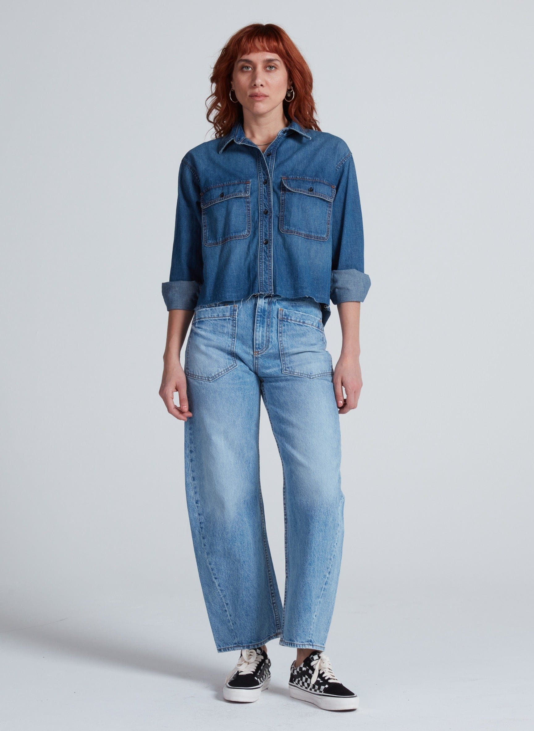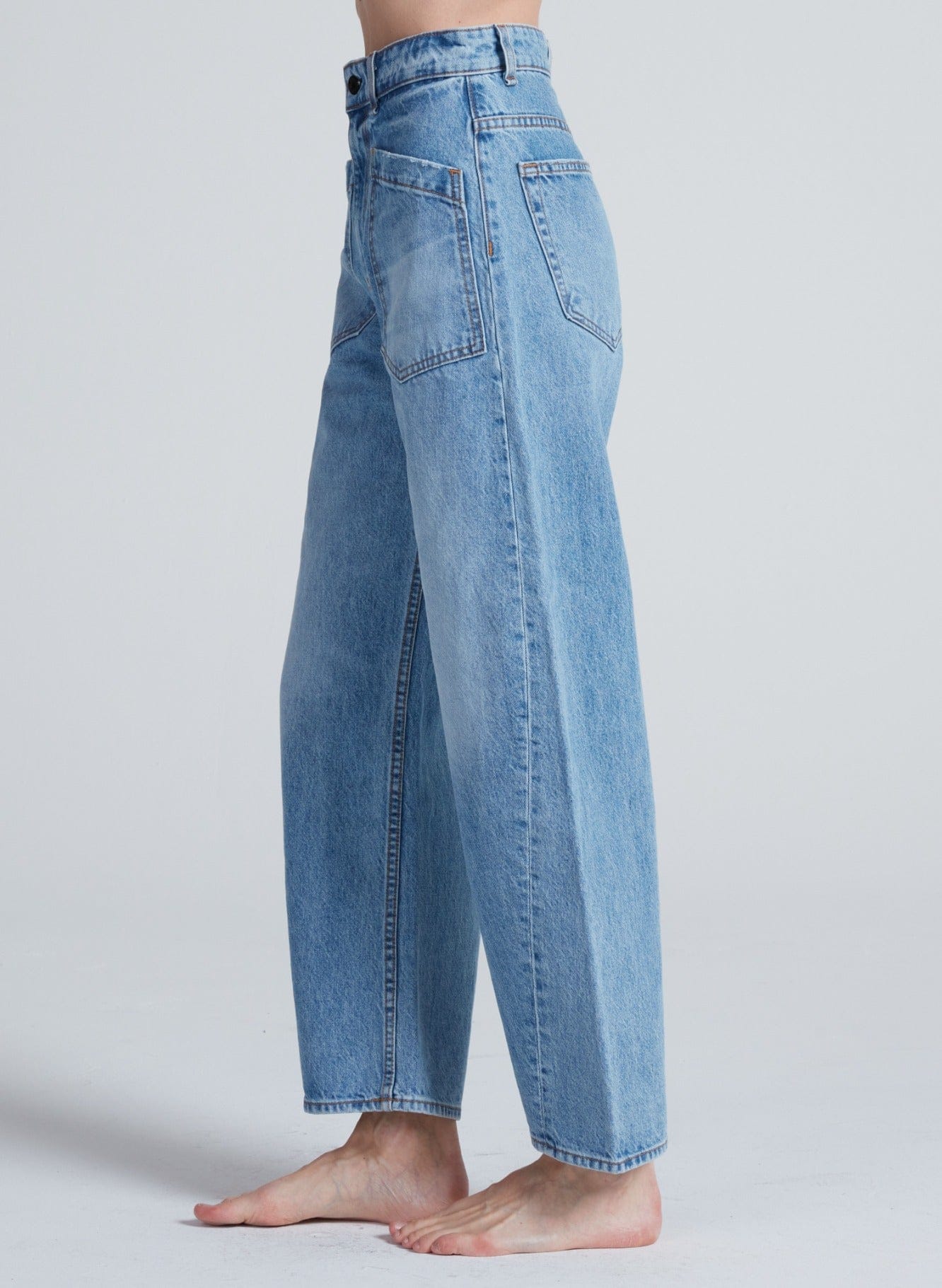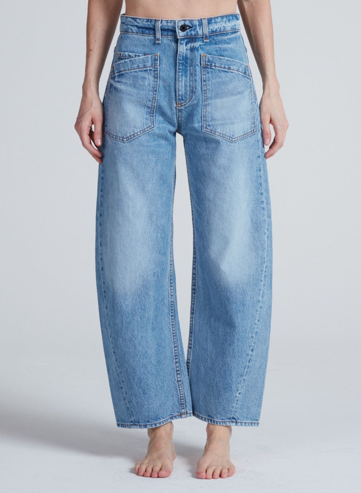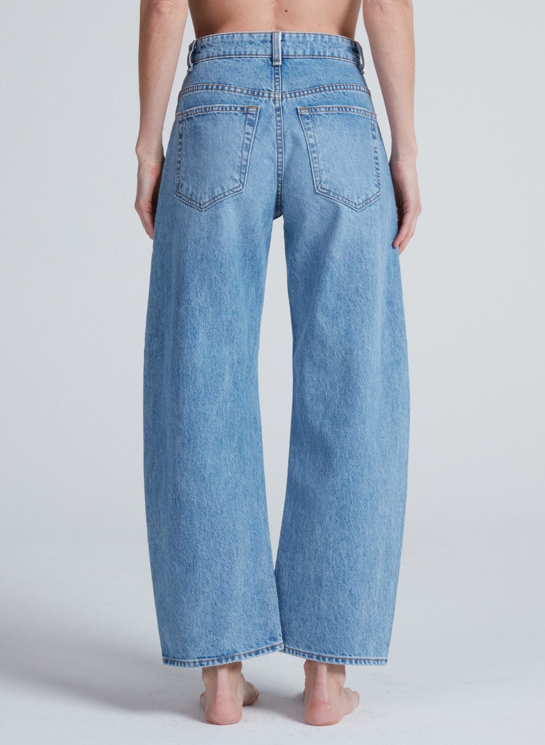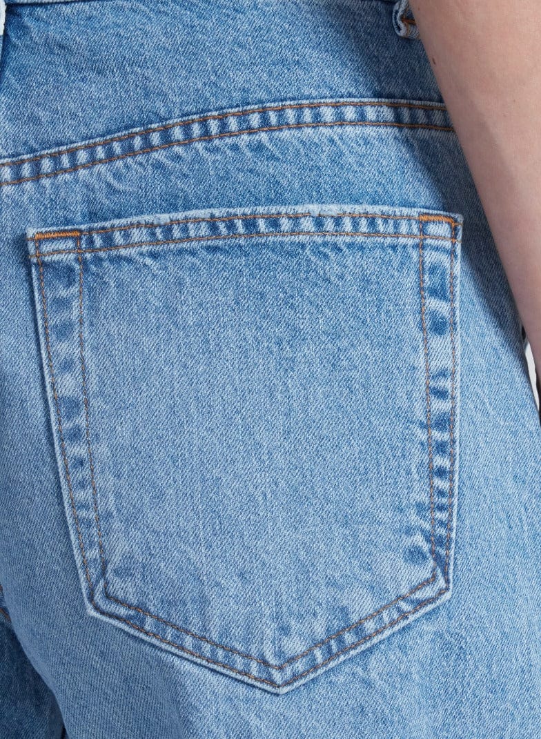 A signature barrel leg with a twist—literally. The Twisted Barrel is designed with a barrel curve that creates a subtly sculpted shape from hip to hem. It sits high on the waist with a relaxed leg and cropped inseam for a modern silhouette that looks effortless.
